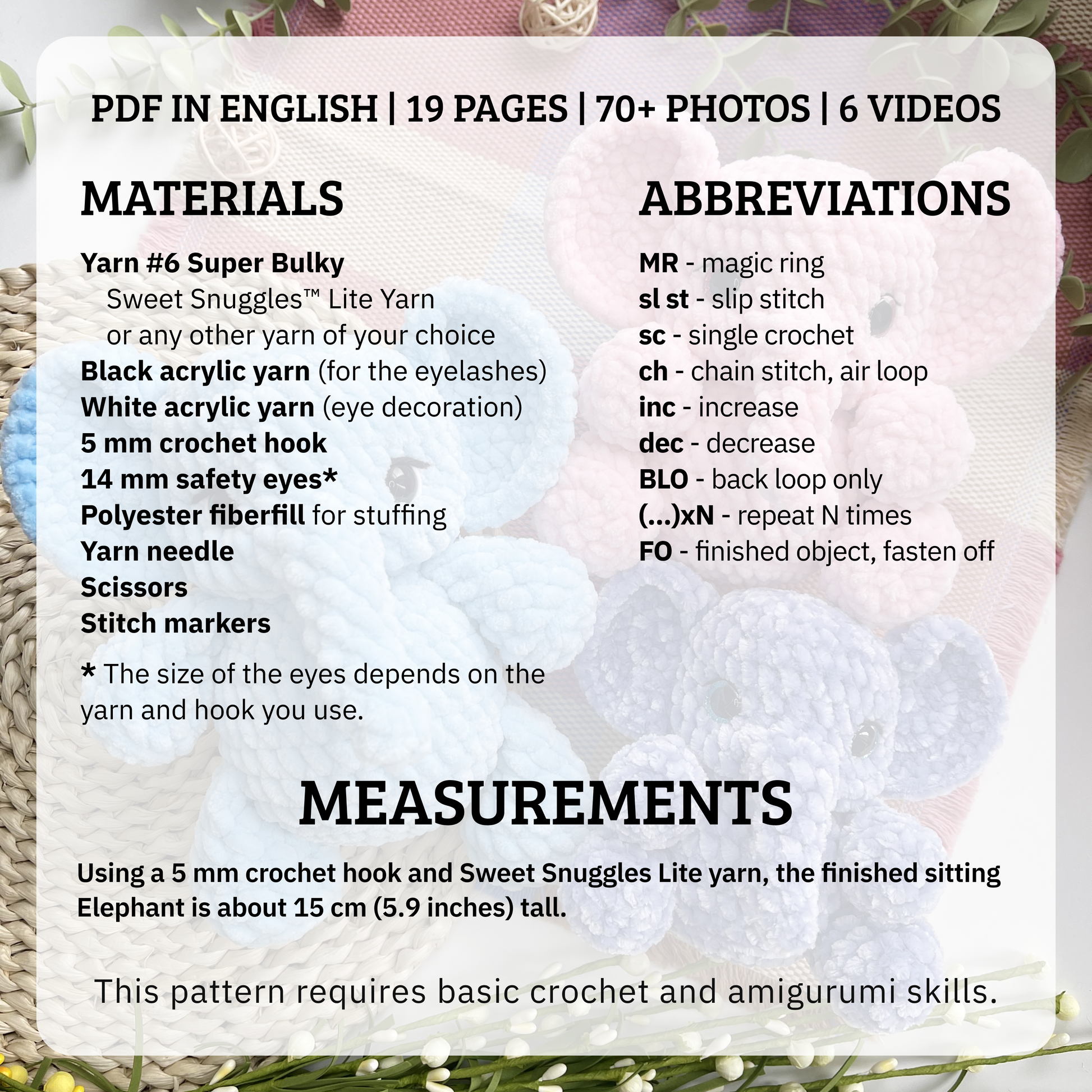 📏 Size: Using a 5 mm crochet hook and Sweet Snuggles Lite yarn, the finished Elephant sitting will be 15 cm (5.9 inches) long.