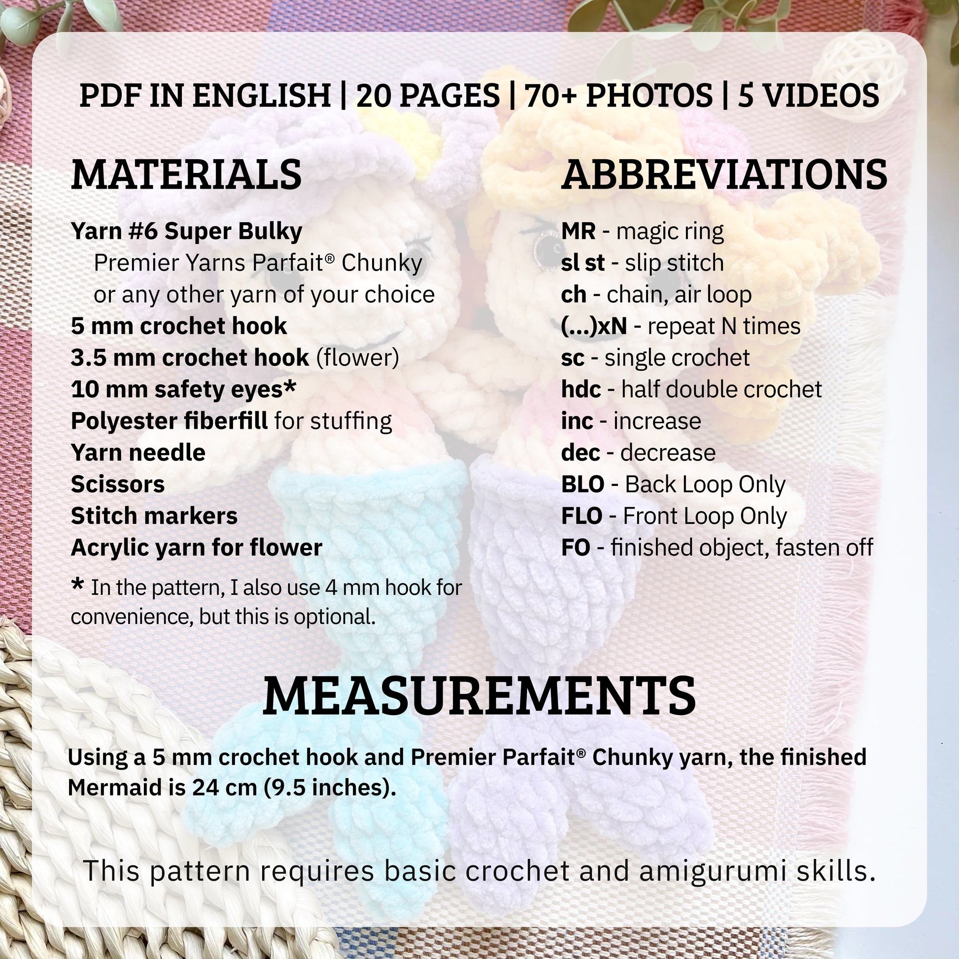 Using a 5 mm crochet hook and Premier Parfait® Chunky yarn, the finished Mermaid is 24 cm (9.5 inches).
